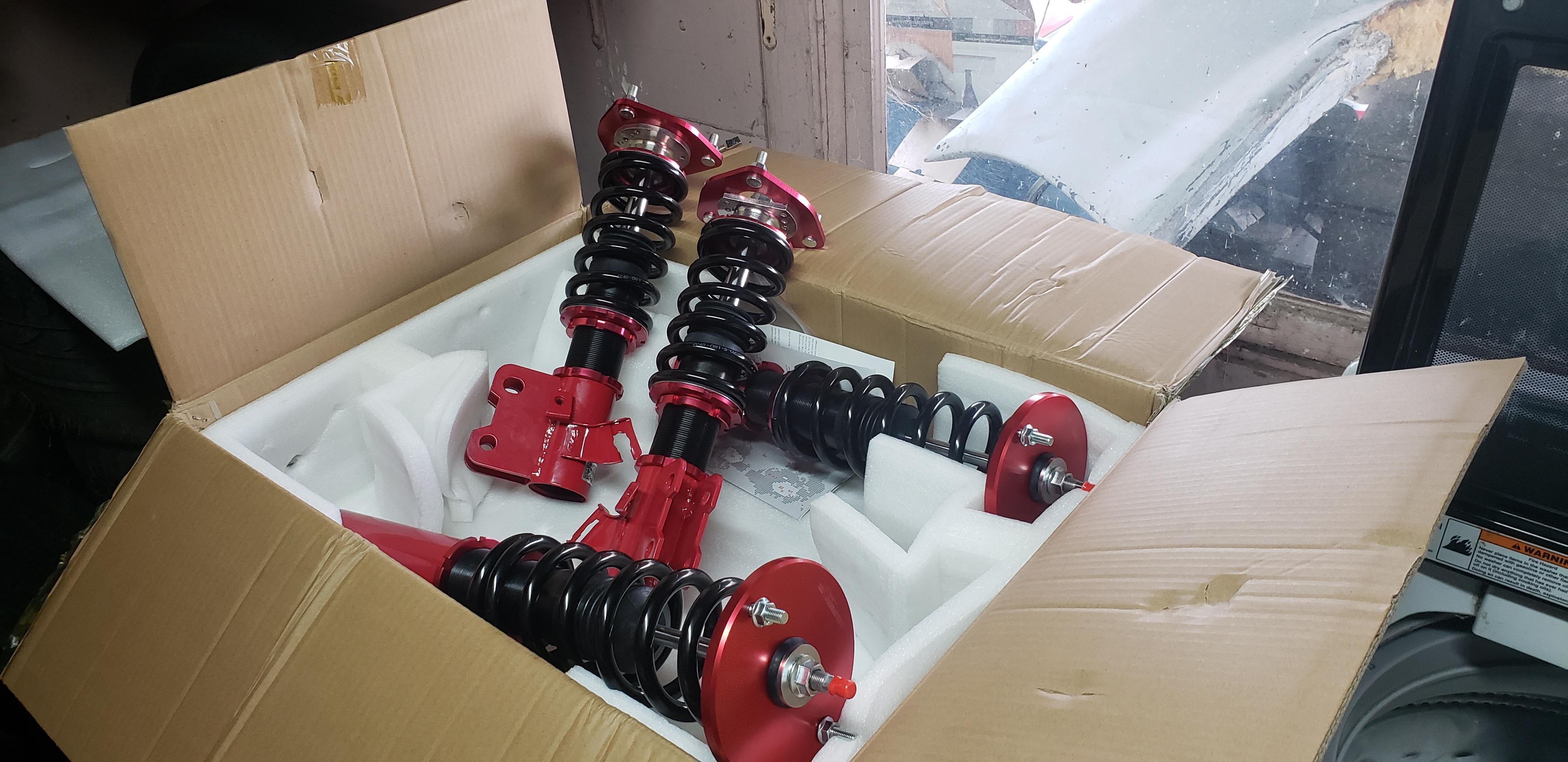 This write up is to break down the video in text of my experience with the coilovers. MaXpeedingRods has locations in the US so shipping was actually really quick. I got them within the first week after ordering them. I have ordered some before for other cars and they came in a blank box and was package terribly. However they have been working on their branding and now the ones I got for my s14 were in a better looking box and package neatly. Which was really a step up. Thank you cards, info and material of the coilovers, the works.